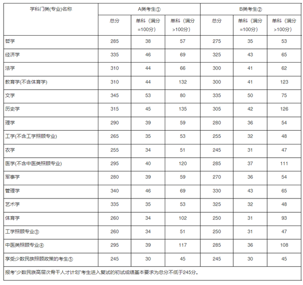 國家線是指教育部公布的全國碩士研究生招生考試考生進入復試的初試成績基本要求,是考生是否進入研究生復試的重要依據。2017年考研國家線如下: